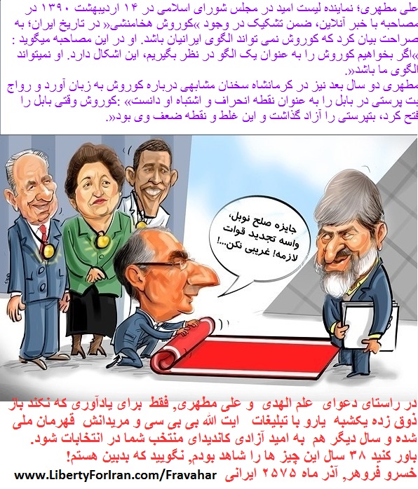 در راستای دعوای علم الهدی و علی مطهری, فقط برای یادآوری که نکند باز ذوق زده یکشبه یارو با تبلیغات ایت الله بی بی سی و مریدانش قهرمان ملی شده و سال دیگر هم به امید آزادی کاندیدای منتخب شما در انتخابات شود. باور کنید ۳۸ سال این چیز ها را شاهد بودم, نگویید که بدبین هستم!